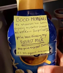Rather than engaging in a direct confrontation, Savannah devised a unique and attention-grabbing strategy – she substituted the creamer with her own breast milk. A week later, as reported by Daily Mail, Savannah elevated the prank by attaching a note to the container: “Good morning! To whomever has been enjoying my coffee creamer all week… surprise! You’ve been drinking my breast milk. Hope you’ve enjoyed. Cheers!” She added a playful touch with a “PS: It’s organic, so no worries.”