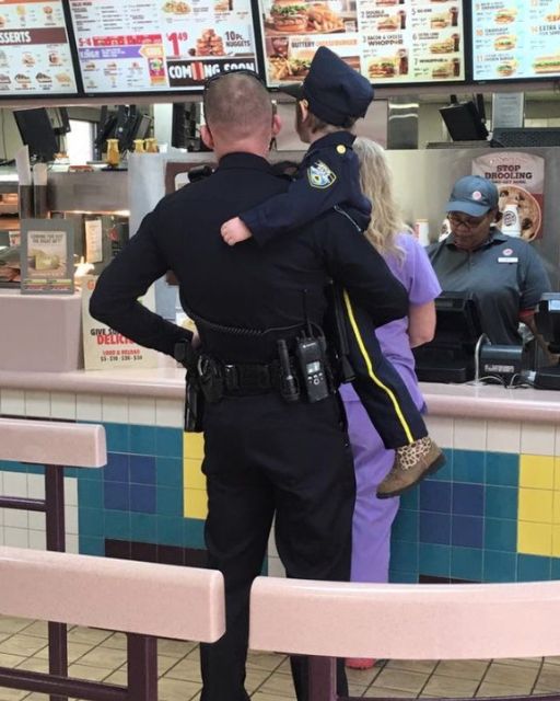 The officer laughed and said, “Well, how about you help me with an important mission—picking the best burger on the menu?”
