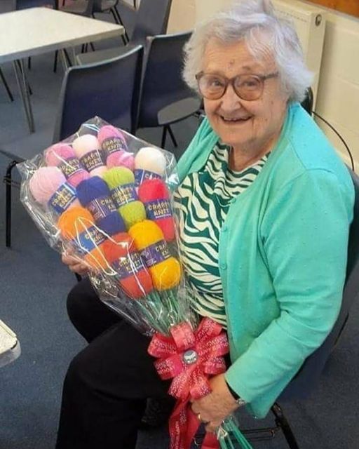 She’s been knitting since Nixon was in office. Birthdays, breakups, baptisms—everything gets a scarf. So when the staff at her craft group gave her that giant bouquet of yarn, she nearly teared up. Even made us take a photo for her bridge club newsletter.