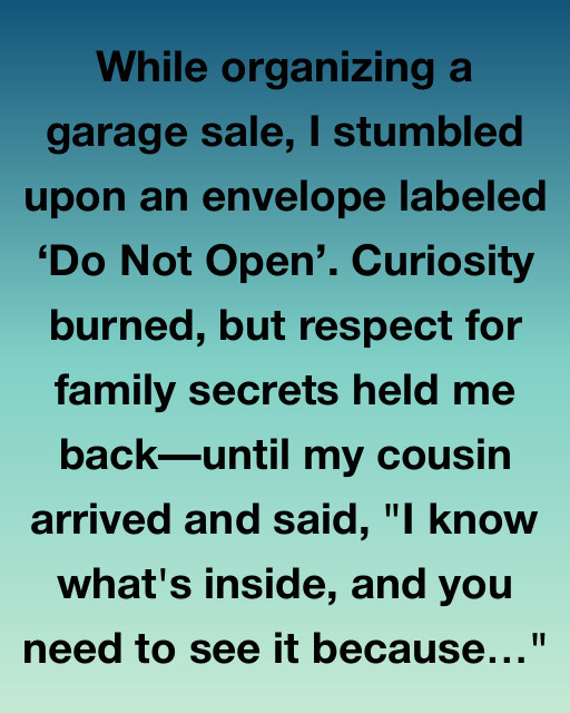 While organizing a garage sale, I stumbled upon an envelope labeled ‘Do Not Open’. Curiosity burned, but respect for family secrets held me back—until my cousin arrived and said, “I know what’s inside, and you need to see it because it might change how you view your family history.” She looked serious, more serious than I’d ever seen her, as she reached for the envelope with gentle hands.