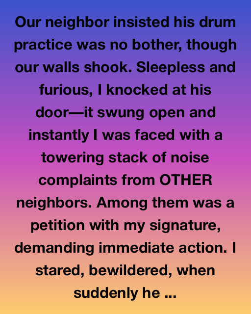 Our neighbor insisted his drum practice was no bother, though our walls shook. Sleepless and furious, I knocked at his door—it swung open and instantly I was faced with a towering stack of noise complaints from OTHER neighbors. Among them was a petition with my signature, demanding immediate action. I stared, bewildered, when suddenly he stepped aside, revealing a room filled with musical instruments.