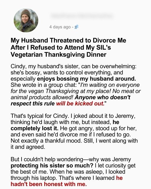 My Husband Threatened to Divorce Me After I Refused to Attend My SIL’s Vegetarian Thanksgiving Dinner