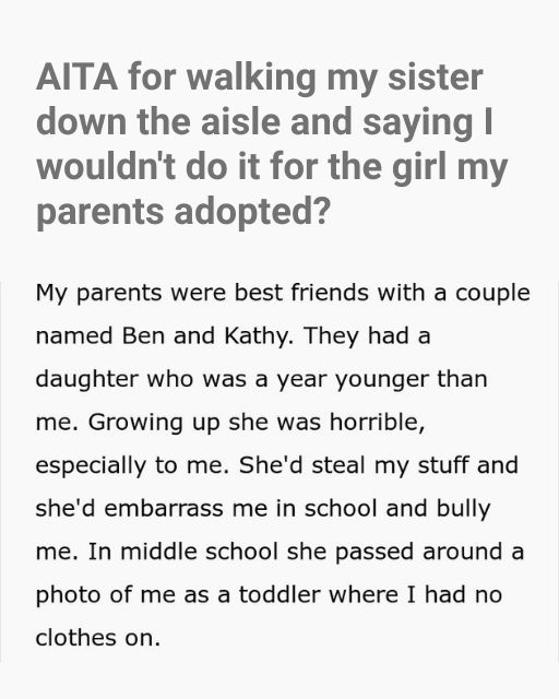 I Refuse To Walk My Adopted Sister Down The Aisle And My Family Is Going To Disown Me